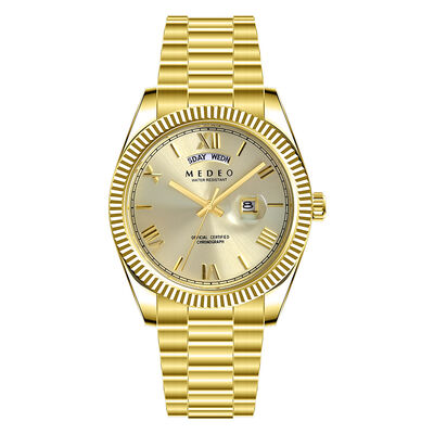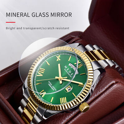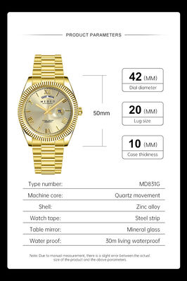 This MEDEO MD831G luxury gold watch is equipped with a quartz movement, which is accurate and stable, with low power consumption and strong durability. The case is made of zinc alloy and has undergone precision gold plating, which has a luxurious texture and is wear-resistant and scratch-resistant. The mineral glass mirror transmits light clearly, and the 30M life waterproof is suitable for daily hand washing, rain and other scenarios. 42mm diameter + 10mm thickness, with Roman numeral hour markers + dual calendar (day / date) display, it has both luxury style and practical functions, perfectly suitable for business men, light luxury watches, gift watches and other categories, helping the terminal to create a differentiated selling point of "luxury gold plating + dual calendar function" and enhance market competitiveness.