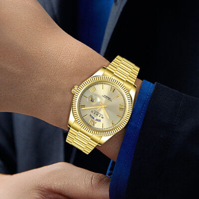 It provides multi-color options such as all-gold, inter-gold green dials, Roman numeral hour markers + dual calendar display + gold-plated technology, which has both business calmness and luxurious texture. 30M life waterproof + zinc alloy case attributes, suitable for daily commuting, business meetings, parties, gifts and other scenarios, to meet the core needs of men's "appearance + practicality + luxury", but also to business, light luxury, gift-giving brand positioning, for B2B buyers to broaden terminal sales scenarios.