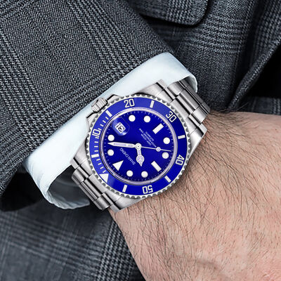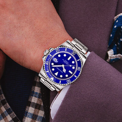The Executive Look: The polished steel and deep blue dial pair perfectly with a tailored navy or charcoal grey suit—the quintessential "Business Diver."