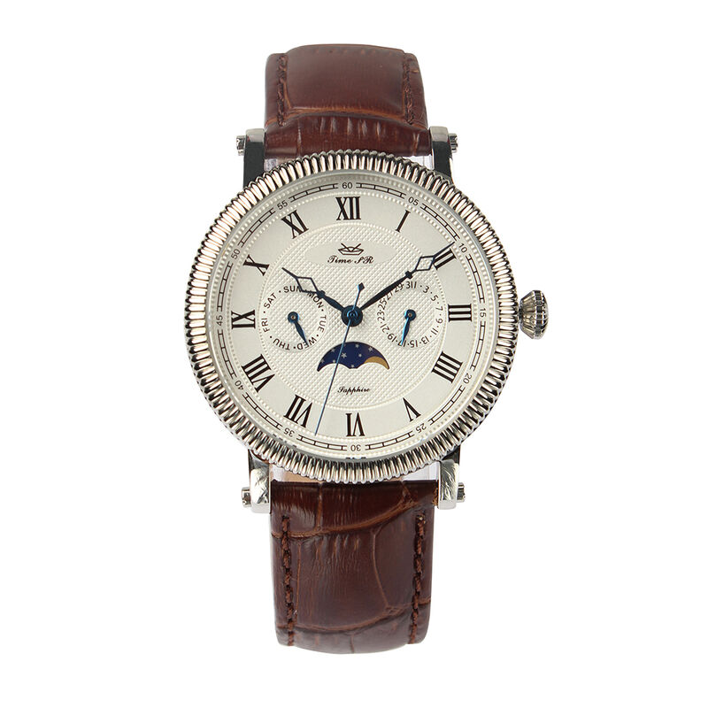Inspired by 19th-century European horology and the romance of celestial observation, this watch pairs a textured white dial and Roman numerals with a poetic moon-phase complication—a nod to watchmaking’s astronomical roots. The 316L stainless steel case with its intricately textured bezel blends vintage craftsmanship with modern durability, while the crocodile-pattern leather strap recalls classic European luxury for a refined, timeless finish.