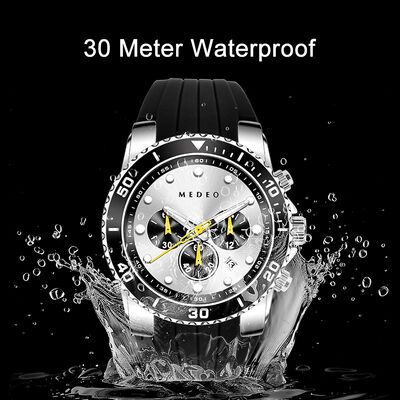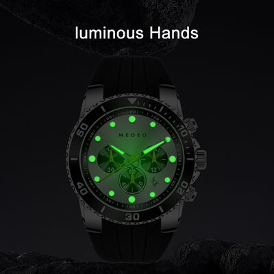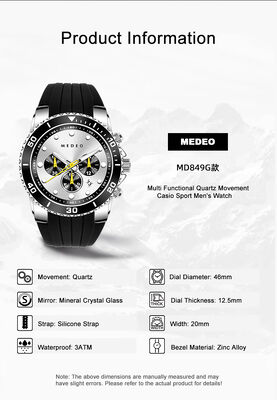 This MEDEO sports watch is equipped with a multi-function quartz movement that supports trinocular chronograph (stopwatch / split chronograph) + date display to accurately meet the needs of sports timekeeping. The 46mm large diameter is paired with a rotating diving bezel + luminous dial, which is clear when reading at night and has a sporty style. The case is made of zinc alloy + stainless steel, which has a tough texture and is wear-resistant and scratch-resistant; Mineral glass crystal is scratch-resistant and wear-resistant, and 3ATM waterproof is suitable for light sports scenarios such as daily hand washing, rain, and light swimming; Paired with a silicone strap, it is breathable and skin-friendly, soft and comfortable, and does not slip easily during exercise. Green/blue/red/black four colors are available, with strong visual impact, perfectly adapted to men's sports, outdoor, daily commuting and other categories, helping the terminal to create a differentiated selling point of "cost-effective + sports multi-functional" and enhance market competitiveness.