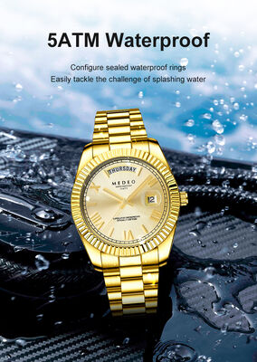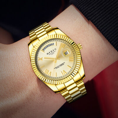 This MEDEO MD846G men's watch is equipped with a precise quartz movement, which is stable and reliable, and the day + date dual calendar (Day-Date) function takes into account daily practicality and is easy to read. The case is made of zinc alloy, which is precision gold-plated / rose gold / brushed for a luxurious texture and wear-resistant scratch resistance. The mirror surface of mineral glass transmits light clearly, and the 5ATM life waterproof is suitable for daily hand washing, rain and other scenarios, meeting the dual needs of business and life. 40mm diameter + 20mm strap width, ring design + Roman hour markers, strong visual hierarchy; With stainless steel strap + butterfly double snap buckle, it is stable to wear and easy to operate, and the gold/rose gold/silver three-color case is available, which has both business luxury and classic style, perfectly adapting to men's business, light luxury, gift watches and other categories, helping the terminal to create a differentiated selling point of "double calendar + waterproof + butterfly buckle" and enhance market competitiveness.