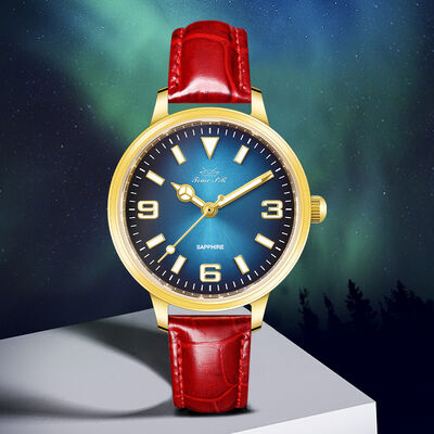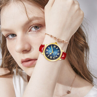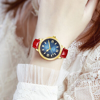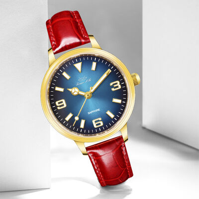 This watch draws from vintage luxury aesthetics (gold-tone case + crocodile-pattern leather strap echo classic upscale timepieces) and modern color contrast (deep blue gradient dial pairs with rich red leather for a bold, sophisticated balance). The sapphire crystal adds a high-end, durable touch, blending timeless elegance with everyday practicality.