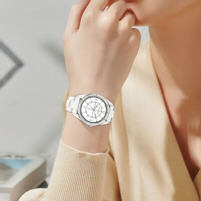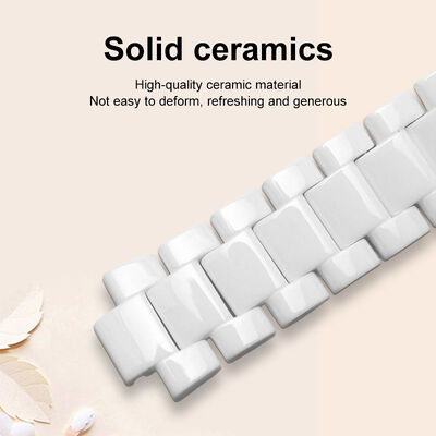 The timepiece features a high-density solid ceramic strap designed with a smooth, skin-friendly finish. Unlike traditional metal bands, this ceramic material is hypoallergenic, scratch-resistant, and maintains a constant comfortable temperature against the wrist. The integrated butterfly clasp ensures a seamless flow from the case to the bracelet.