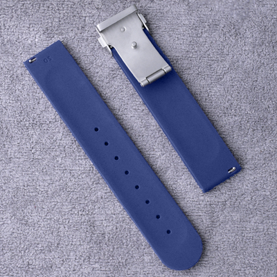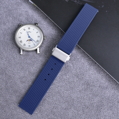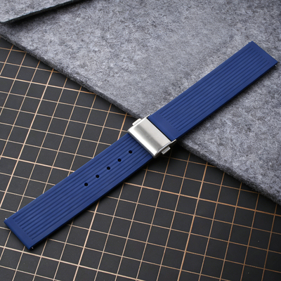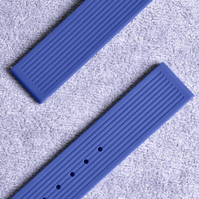 The strap features linear vertical grooves that draw the eye toward the watch face, complementing the intricate fluted bezel of classical and moon-phase watches. The deep blue hue is chosen to enhance the "Sapphire" or "Moon-phase" elements of a dial, bridging the gap between a rugged dive-style material and a dress-watch silhouette.