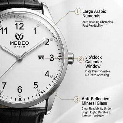 Optimum Legibility: Large Arabic numerals paired with a specialized Anti-Reflective Mineral Glass ensures the wearer has instant time-awareness under any lighting condition—from bright office LEDs to outdoor sunlight.